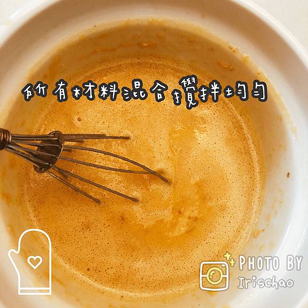 首先,雞蛋打散均勻、燕麥片用熱水泡軟(其實不泡軟也可以增加口感)、香蕉壓成泥。