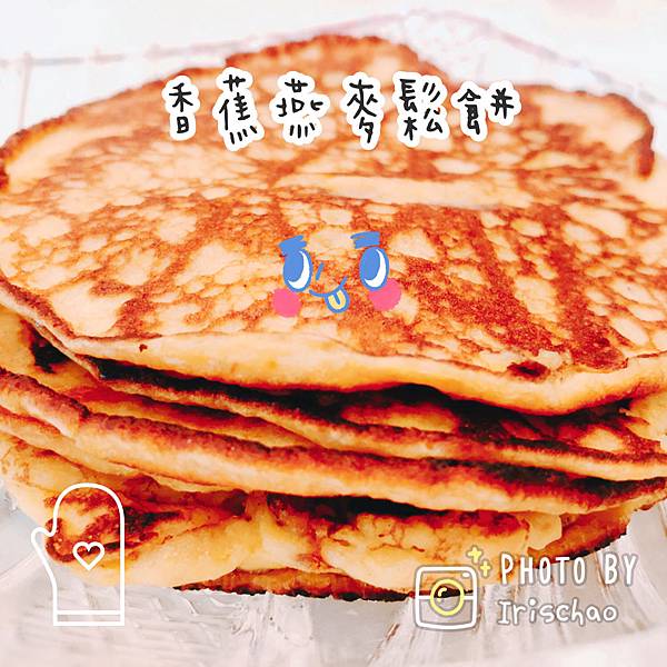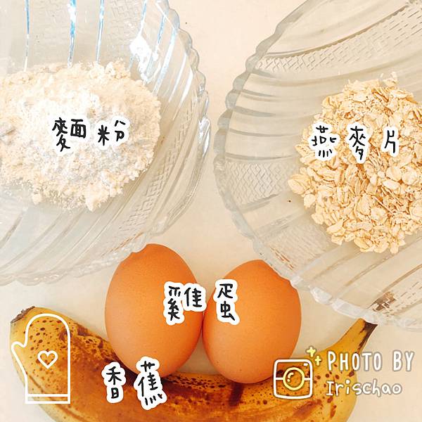 材料:中筋麵粉適量(約1/3碗)、燕麥片適量、雞蛋兩顆、香蕉一條