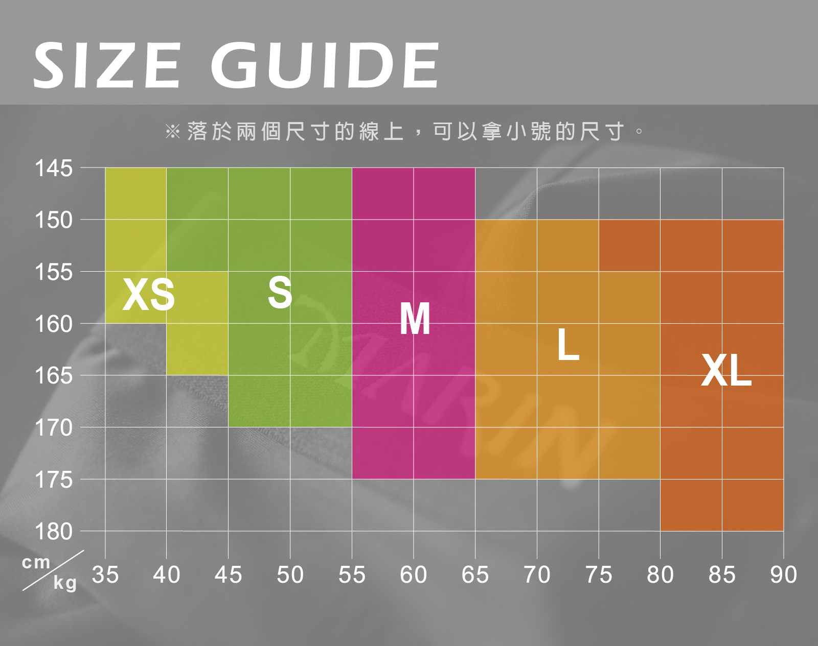 XS、S、M、L、XL,從35公斤到90公斤都能穿哦~